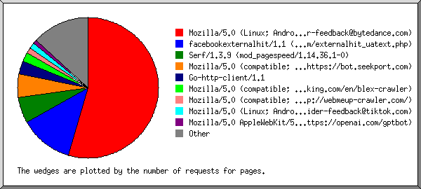 #reqs: #pages: browser -------: -------: ------- 2152225: 2037146: Mozilla/5.0 (Linux; Android 5.0) AppleWebKit/537.36 (KHTML, like Gecko) Mobile Safari/537.36 (compatible; Bytespider; spider-feedback@bytedance.com) 457642: 457528: facebookexternalhit/1.1 (+http://www.facebook.com/externalhit_uatext.php) 781958: 224679: Serf/1.3.9 (mod_pagespeed/1.14.36.1-0) 202235: 201905: Mozilla/5.0 (compatible; SeekportBot; +https://bot.seekport.com) 145416: 108052: Go-http-client/1.1 82051: 82045: Mozilla/5.0 (compatible; BLEXBot/1.0; +https://help.seranking.com/en/blex-crawler) 54850: 54842: Mozilla/5.0 (compatible; BLEXBot/1.0; +http://webmeup-crawler.com/) 55468: 45169: Mozilla/5.0 (Linux; Android 5.0) AppleWebKit/537.36 (KHTML, like Gecko) Mobile Safari/537.36 (compatible; TikTokSpider; ttspider-feedback@tiktok.com) 38067: 37821: Mozilla/5.0 AppleWebKit/537.36 (KHTML, like Gecko; compatible; GPTBot/1.2; +https://openai.com/gptbot) 35799: 35603: Mozilla/5.0 (X11; Linux x86_64) AppleWebKit/537.36 (KHTML, like Gecko) HeadlessChrome/117.0.5938.60 Safari/537.36 32782: 32782: serpstatbot/2.1 (advanced backlink tracking bot; https://serpstatbot.com/; abuse@serpstatbot.com) 24828: 24828: Python/3.10 aiohttp/3.9.3 22665: 22542: Mozilla/5.0 (Linux; Android 6.0.1; Nexus 5X Build/MMB29P) AppleWebKit/537.36 (KHTML, like Gecko) Chrome/137.0.7151.103 Mobile Safari/537.36 (compatible; Googlebot/2.1; +http://www.google.com/bot.html) 15872: 15866: Mozilla/5.0 (compatible; AwarioBot/1.0; +https://awario.com/bots.html) 15175: 15106: Mozilla/5.0 (Linux; Android 6.0.1; Nexus 5X Build/MMB29P) AppleWebKit/537.36 (KHTML, like Gecko) Chrome/129.0.6668.89 Mobile Safari/537.36 (compatible; Googlebot/2.1; +http://www.google.com/bot.html) 14458: 14433: Mozilla/5.0 (compatible; crawler) 14428: 14339: Mozilla/5.0 (Linux; Android 6.0.1; Nexus 5X Build/MMB29P) AppleWebKit/537.36 (KHTML, like Gecko) Chrome/138.0.7204.183 Mobile Safari/537.36 (compatible; Googlebot/2.1; +http://www.google.com/bot.html) 13199: 12087: Mozilla/5.0 (compatible; Bytespider; spider-feedback@bytedance.com) AppleWebKit/537.36 (KHTML, like Gecko) Chrome/70.0.0.0 Safari/537.36 11445: 11140: Mozilla/5.0 (Windows NT 6.1; Win64; x64) AppleWebKit/537.36 (KHTML, like Gecko) Chrome/126.0.6478.114 Safari/537.36 9073: 9016: Mozilla/5.0 (Linux; Android 6.0.1; Nexus 5X Build/MMB29P) AppleWebKit/537.36 (KHTML, like Gecko) Chrome/131.0.6778.139 Mobile Safari/537.36 (compatible; Googlebot/2.1; +http://www.google.com/bot.html) 9086: 8945: Mozilla/5.0 (compatible; YandexBot/3.0; +http://yandex.com/bots) 8441: 8403: Mozilla/5.0 (Windows NT 10.0; Win64; x64) AppleWebKit/537.36 (KHTML, like Gecko) Chrome/133.0.0.0 Safari/537.36 8721: 8376: Mozilla/5.0 AppleWebKit/537.36 (KHTML, like Gecko; compatible; bingbot/2.0; +http://www.bing.com/bingbot.htm) Chrome/116.0.1938.76 Safari/537.36 7195: 7193: python-requests/2.30.0 5443: 5357: Mozilla/5.0 AppleWebKit/537.36 (KHTML, like Gecko; compatible; ClaudeBot/1.0; +claudebot@anthropic.com) 5397: 5273: Mozilla/5.0 AppleWebKit/537.36 (KHTML, like Gecko; compatible; Amazonbot/0.1; +https://developer.amazon.com/support/amazonbot) Chrome/119.0.6045.214 Safari/537.36 5335: 5132: Mozilla/5.0 (Linux; Android 6.0.1; Nexus 5X Build/MMB29P) AppleWebKit/537.36 (KHTML, like Gecko) Chrome/139.0.7258.127 Mobile Safari/537.36 (compatible; Googlebot/2.1; +http://www.google.com/bot.html) 5143: 5098: Mozilla/5.0 (Linux; Android 6.0.1; Nexus 5X Build/MMB29P) AppleWebKit/537.36 (KHTML, like Gecko) Chrome/130.0.6723.69 Mobile Safari/537.36 (compatible; Googlebot/2.1; +http://www.google.com/bot.html) 5117: 5036: Mozilla/5.0 (Linux; Android 6.0.1; Nexus 5X Build/MMB29P) AppleWebKit/537.36 (KHTML, like Gecko) Chrome/125.0.6422.175 Mobile Safari/537.36 (compatible; Googlebot/2.1; +http://www.google.com/bot.html) 5394: 4833: Mozilla/5.0 (Windows NT 10.0; Win64; x64) AppleWebKit/537.36 (KHTML, like Gecko) Chrome/131.0.0.0 Safari/537.36 4681: 4680: python-requests/2.29.0 4494: 4369: Mozilla/5.0 (Linux; Android 6.0.1; Nexus 5X Build/MMB29P) AppleWebKit/537.36 (KHTML, like Gecko) Chrome/128.0.6613.137 Mobile Safari/537.36 (compatible; Googlebot/2.1; +http://www.google.com/bot.html) 4343: 4336: Mozilla/5.0 (Windows NT 10.0; Win64; x64) AppleWebKit/537.36 (KHTML, like Gecko) Chrome/116.0.0.0 Safari/537.36 3863: 3637: Mozilla/5.0 (Windows NT 10.0; Win64; x64) AppleWebKit/537.36 (KHTML, like Gecko) Chrome/114.0.0.0 Safari/537.36 Edg/114.0.1823.43 3681: 3565: Mozilla/5.0 (Linux; Android 6.0.1; Nexus 5X Build/MMB29P) AppleWebKit/537.36 (KHTML, like Gecko) Chrome/131.0.6778.69 Mobile Safari/537.36 (compatible; Googlebot/2.1; +http://www.google.com/bot.html) 3402: 3263: Mozilla/5.0 (Linux; Android 6.0.1; Nexus 5X Build/MMB29P) AppleWebKit/537.36 (KHTML, like Gecko) Chrome/134.0.6998.165 Mobile Safari/537.36 (compatible; Googlebot/2.1; +http://www.google.com/bot.html) 2965: 2921: Mozilla/5.0 (iPhone; CPU iPhone OS 13_2_3 like Mac OS X) AppleWebKit/605.1.15 (KHTML, like Gecko) Version/13.0.3 Mobile/15E148 Safari/604.1 2842: 2691: Mozilla/5.0 (Windows NT 10.0; Win64; x64) AppleWebKit/537.36 (KHTML, like Gecko) Chrome/109.0.0.0 Safari/537.36 2960: 2646: Mozilla/5.0 (Windows NT 10.0; Win64; x64) AppleWebKit/537.36 (KHTML, like Gecko) Chrome/120.0.0.0 Safari/537.36 2560: 2555: Mozilla/5.0 (Linux; Android 6.0.1; Nexus 5X Build/MMB29P) AppleWebKit/537.36 (KHTML, like Gecko) Chrome/140.0.7339.127 Mobile Safari/537.36 (compatible; Googlebot/2.1; +http://www.google.com/bot.html) 186249: 157238: [not listed: 17,324 browsers]