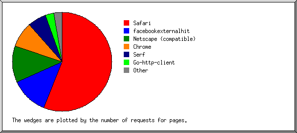 #: #reqs: #pages: browser --: -------: -------: ------- 1: 2217221: 2090851: Safari : 2209125: 2083590: Safari/537 : 5675: 5382: Safari/604 : 1631: 1204: Safari/605 : 264: 245: Safari/536 : 261: 235: Safari/534 : 22: 22: Safari/125 : 22: 22: Safari/312 : 18: 16: Safari/533 : 16: 14: Safari/602 : 11: 11: Safari/601 2: 458158: 457741: facebookexternalhit : 458158: 457741: facebookexternalhit/1 3: 430256: 428116: Netscape (compatible) 4: 325354: 307091: Chrome : 38623: 38046: Chrome/117 : 27003: 25190: Chrome/131 : 24948: 24354: Chrome/137 : 17987: 17712: Chrome/129 : 17224: 16464: Chrome/138 : 14349: 13904: Chrome/133 : 13345: 13259: Chrome/100 : 13534: 12937: Chrome/116 : 13313: 12369: Chrome/126 : 13237: 12124: Chrome/70 5: 781958: 224679: Serf : 781958: 224679: Serf/1 6: 145514: 108146: Go-http-client : 145416: 108052: Go-http-client/1 : 98: 94: Go-http-client/2 7: 32782: 32782: serpstatbot : 32782: 32782: serpstatbot/2 8: 24859: 24851: Python : 24859: 24851: Python/3 9: 15695: 12384: Firefox : 3290: 2971: Firefox/26 : 1229: 1097: Firefox/25 : 1075: 1044: Firefox/123 : 1122: 826: Firefox/115 : 747: 670: Firefox/27 : 663: 652: Firefox/54 : 676: 574: Firefox/128 : 566: 520: Firefox/24 : 494: 441: Firefox/36 : 323: 311: Firefox/3 10: 12091: 12019: python-requests : 12091: 12019: python-requests/2 11: 3361: 3056: MSIE : 1717: 1579: MSIE/11 : 817: 728: MSIE/10 : 633: 564: MSIE/9 : 156: 149: MSIE/8 : 16: 15: MSIE/6 : 12: 12: MSIE/7 : 3: 3: MSIE/4 : 4: 3: MSIE/5 12: 2486: 2486: WordPress : 2486: 2486: WordPress/6 13: 6232: 2337: Googlebot-Image : 6232: 2337: Googlebot-Image/1 14: 2556: 2080: meta-externalagent : 2556: 2080: meta-externalagent/1 15: 737: 674: Friendly_Crawler : 737: 674: Friendly_Crawler/Nutch-1 16: 659: 659: Sogou web spider : 659: 659: Sogou web spider/4 17: 690: 395: Maillocals Bot 18: 415: 320: Opera : 378: 289: Opera/9 : 35: 29: Opera/8 : 2: 2: Opera/7 19: 278: 269: mozilla : 278: 269: mozilla/5 20: 511: 258: IonCrawl (https: : 511: 258: IonCrawl (https://www : 5135: 1282: [not listed: 106 browsers]