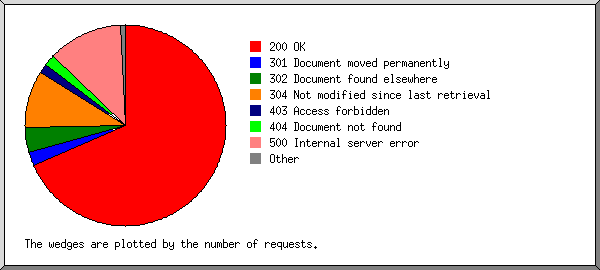 #reqs: status code -------: ----------- 3901845: 200 OK 503: 204 OK, but nothing to send 37133: 206 Partial content 119322: 301 Document moved permanently 235838: 302 Document found elsewhere 528369: 304 Not modified since last retrieval 18: 400 Bad request 89631: 403 Access forbidden 101852: 404 Document not found 12: 405 Method not allowed 6: 409 Request conflicts with state of resource 1: 416 Requested range not valid 23: 4xx [Miscellaneous client/user errors] 697149: 500 Internal server error 1621: 504 Gateway timeout
