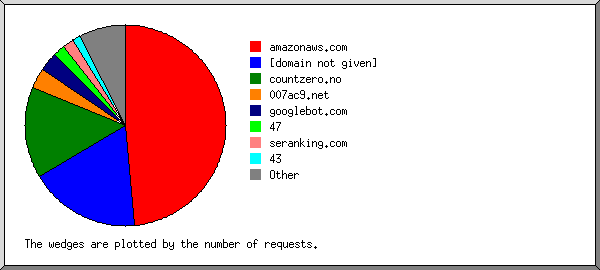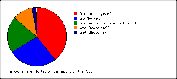 #reqs: %bytes: domain -------: ------: ------ 806676: 39.65%: [domain not given] 662872: 26.76%: .no (Norway) 387538: 19.72%: [unresolved numerical addresses] 2421911: 11.09%: .com (Commercial) 165522: 2.33%: .net (Networks) 5642: 0.18%: [unknown domain] 12284: 0.12%: .de (Germany) 2730: 0.07%: .br (Brazil) 1057: 0.03%: .vn (Vietnam) 21: 0.01%: .tr (Turkey) 319: 0.01%: .ar (Argentina) 84: : .py (Paraguay) 213: : .ec (Ecuador) 116: : .mx (Mexico) 53: : .id (Indonesia) 58: : .ru (Russia) 43: : .co (Colombia) 14: : .in (India) 12: : .jp (Japan) 12: : .kz (Kazakhstan) 30: : .arpa (Arpanet) 31: : .uy (Uruguay) 3: : .sk (Slovakia) 1: : .gt (Guatemala) 4: : .hn (Honduras) 44: : .cl (Chile) 257: : .edu (US Higher Education) 2: : .jo (Jordan) 36: : .org (Non Profit Making Organizations) 13: : .bg (Bulgaria) 12: : .by (Belarus) 15: : .uz (Uzbekistan) 1: : .th (Thailand) 6: : .ua (Ukraine) 2: : .ae (United Arab Emirates) 1: : .pt (Portugal) 1: : .cz (Czech Republic) 39: : .cn (China) 4: : .se (Sweden) 9: : .lt (Lithuania) 16: : .us (United States) 11: : .do (Dominican Republic) 8: : .ba (Bosnia-Herzegovina) 23: : .ca (Canada) 1: : .gy (Guyana) 14: : .za (South Africa) 4: : .nl (Netherlands) 5: : .io (British Indian Ocean Territory) 1: : .ai (Anguilla) 8: : .kg (Kyrgyzstan) 11: : .bd (Bangladesh) 6: : .is (Iceland) 4: : .bo (Bolivia) 6: : .al (Albania) 5: : .ve (Venezuela) 4: : .pl (Poland) 10: : .fr (France) 2: : .es (Spain) 2: : .cr (Costa Rica) 1: : .cy (Cyprus) 2: : .ke (Kenya) 1: : .sh (Saint Helena) 2: : .ma (Morocco) 4: : .uk (United Kingdom) 1: : .md (Moldova) 1: : .sz (Swaziland) 1: : .pe (Peru) 1: : .pk (Pakistan) 1: : .ao (Angola) 1: : .ci (Ivory Coast) 1: : .cc (Cocos (Keeling) Islands) 1: : .ni (Nicaragua) 1: : .ro (Romania) 2: : .hu (Hungary)