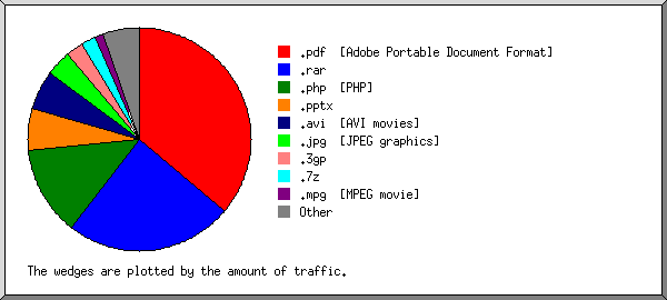 #reqs: %bytes: extension -------: ------: --------- 40884: 36.25%: .pdf [Adobe Portable Document Format] 3409: 24.29%: .rar 3500744: 12.88%: .php [PHP] 557: 6.15%: .pptx 2052: 5.56%: .avi [AVI movies] 27051: 3.79%: .jpg [JPEG graphics] 887: 2.53%: .3gp 215: 2.11%: .7z 790: 1.20%: .mpg [MPEG movie] 976: 0.94%: .mp3 [MP3 sound files] 6656: 0.67%: .bmp 707: 0.50%: .mp4 339: 0.49%: .psd 164: 0.41%: .mkv 4149: 0.39%: .JPG 98: 0.38%: .tif 418305: 0.29%: .css [Cascading Style Sheets] 5542: 0.25%: .png [PNG graphics] 169: 0.20%: .AVI 266: 0.19%: .ASE 223158: 0.15%: .gif [GIF graphics] 40834: 0.10%: [directories] 189898: 0.26%: [not listed: 22 extensions]